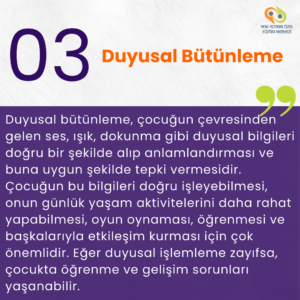 Duyusal bütünleme, çocuğun çevresinden gelen ses, ışık, dokunma gibi duyusal bilgileri doğru bir şekilde alıp anlamlandırması ve buna uygun şekilde tepki vermesidir. Çocuğun bu bilgileri doğru işleyebilmesi, onun günlük yaşam aktivitelerini daha rahat yapabilmesi, oyun oynaması, öğrenmesi ve başkalarıyla etkileşim kurması için çok önemlidir. Eğer duyusal işlemleme zayıfsa, çocukta öğrenme ve gelişim sorunları yaşanabilir.