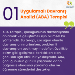 ABA Terapisi, çocuğunuzun davranışlarını anlamak ve geliştirmek için bilimsel bir yöntemdir. Bu terapi, çocuğun olumlu davranışlarını artırırken, problemli davranışları azaltmayı hedefler. Özellikle otizm gibi gelişimsel farklılıkları olan çocuklar için etkili bir yaklaşımdır. ABA, çocuğunuzun günlük yaşamda daha bağımsız olmasına yardımcı olur ve öğrenme süreçlerini destekler.